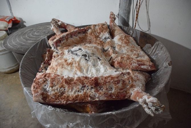 鲜腿撒盐腌制(2019年12月26日摄)