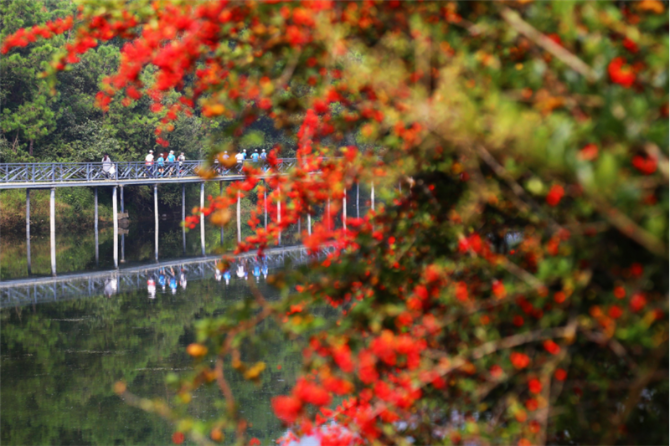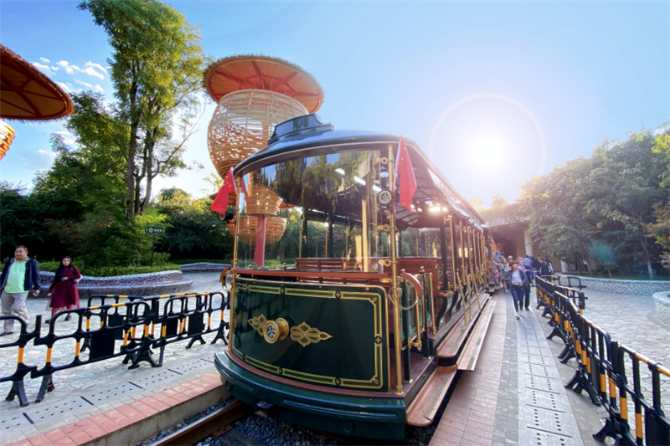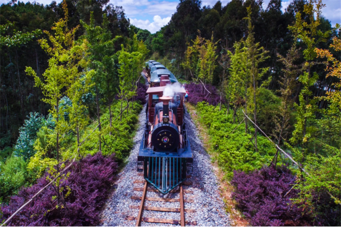 凤龙湾小镇规划建成全长22公里的准轨观光火车铁路,首期已建成8公里,途经梧桐、银杏、樱花、紫藤、梨花、桃花构成的“隧道”。到这里旅游,乘坐观光火车览湖光山色已成为游客的必选项目,而铁轨两旁迎风开放的山花更增加了浪漫的氛围。