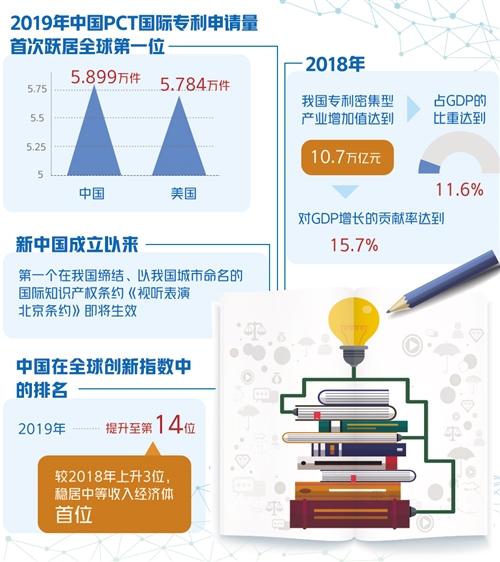 4月20日至26日是全国知识产权宣传周。在4月23日举行的国新办新闻发布会上,国家知识产权局局长申长雨透露了我国知识产权事业取得的显著成绩——2019年中国PCT国际专利申请量首次跃居全球第一位;新中国成立以来第一个在我国缔结、以我国城市命名的国际知识产权条约《视听表演北京条约》即将生效;中国在2019年全球创新指数中的排名提升至第14位,较2018年上升3位,稳居中等收入经济体首位。