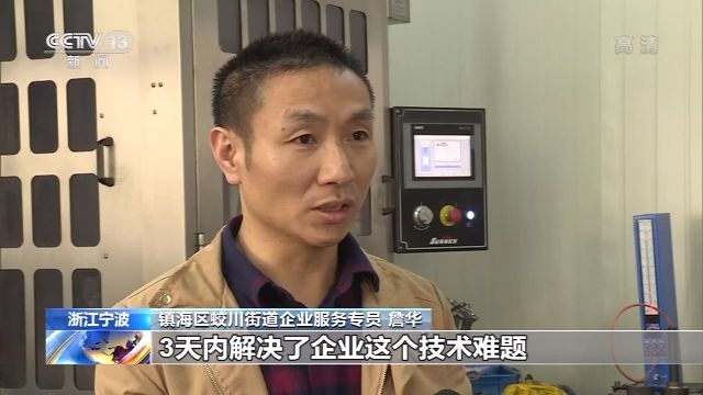 镇海区蛟川街道企业服务专员 詹华:第一时间联系相关专家,成立了4人技术攻关小组,3天内解决了企业这个技术难题。