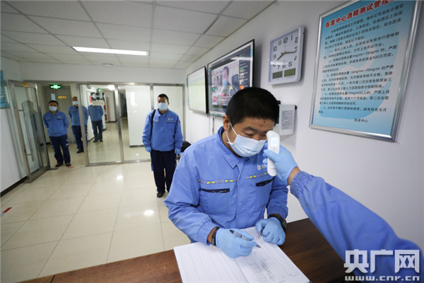 董金峰和同事们上岗前接受体温测量(央广网记者韩靖/摄)