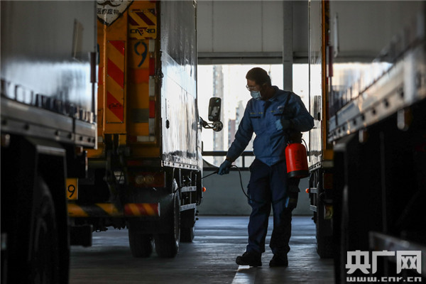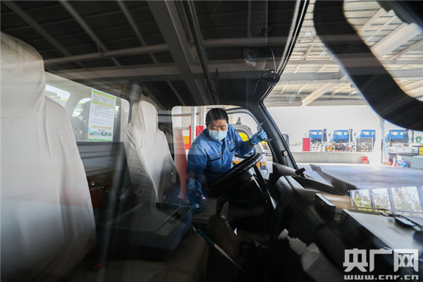 出发前,董金峰对车辆消毒(央广网记者韩靖/摄)