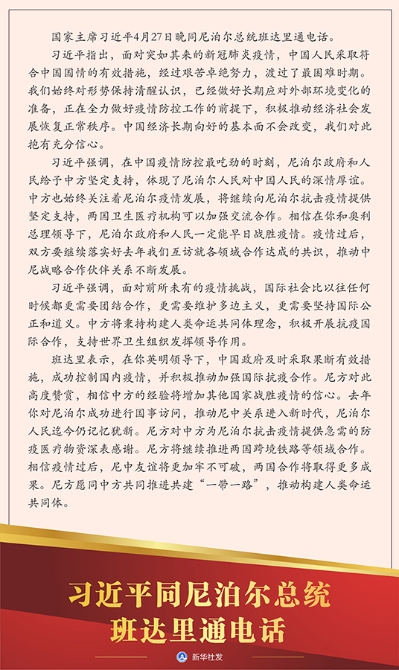 新华社北京4月27日电 国家主席习近平27日晚同尼泊尔总统班达里通电话。