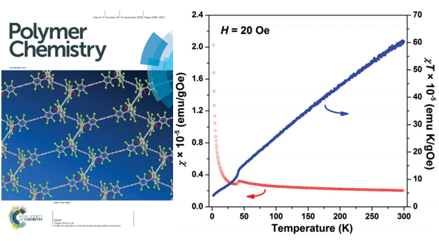 另一方面,项目组首先设计并合成了三甲基自由基作为单体,然后通过自由基单体在液/液界面的聚合,制备了独立的二维有机磁性聚自由基(OMP)纳米片。通过自由基之间的磁交换耦合,获得的二维OMP纳米片具有反铁磁特性,奈耳温度达到42.5K。
