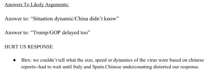 该备忘录提供了三种主要攻击中国的套路:一是污蔑“中国掩盖真相导致病毒蔓延”,二是指责民主党人“对中国态度软弱”,三是强调共和党人将“因中国导致了此次疫情的传播而推动对中国的制裁”。