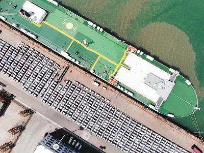 复工复产以来,上汽集团汽车出口数量激增,截至目前已从连云港口岸出口汽车超2.8万台。4月25日, 一艘远洋滚装轮在江苏连云港港69泊位装载国产汽车出口智利。 王 春摄(人民视觉) |