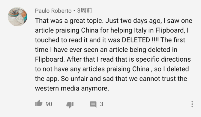 这个主题很棒。就在两天前,我在Flipboard上看到了一篇称赞中国援助的文章,我刚想要读,就被删掉了!这是我第一次看到Flipboard上的文章被删掉。在那以后我知道了他们就是不允许夸中国的文章存在,我就把这个应用卸载了。这也太不公平了,太可悲了。我们再也不能相信任何西方媒体了。