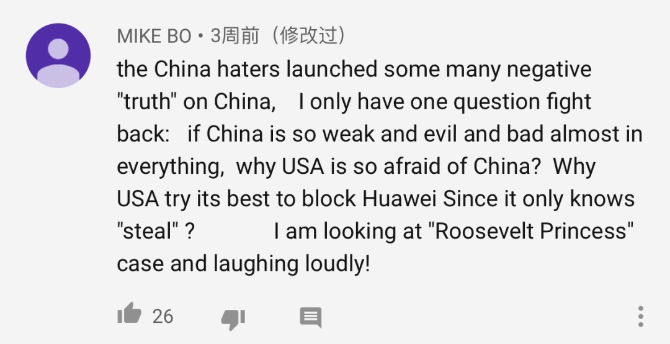 仇华的人编造了很多负面新闻给中国。我只有一个问题:如果中国真的所有地方都这么不堪一击又邪恶,美国为什么要这么怕中国?为什么美国想尽一切办法不让华为进美国?