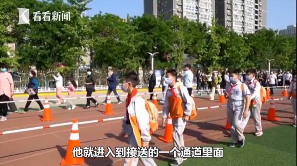 学生分批次排队进入操场跑道