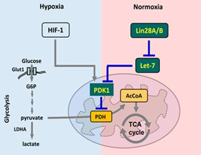 科研人员通过前期的研究发现,在低氧条件下,低氧诱导因子HIF-1转录调控代谢酶PDK1抑制三羧酸循环,部分解释了肿瘤细胞中糖酵解增强的机制。但这并不能解释为什么肿瘤细胞在氧气充足的条件下倾向于利用低效的糖酵解方式这一现象。研究人员以此为切入点展开进一步研究,发现在常氧条件下,肿瘤细胞通过异常表达的Lin28/let-7调节轴转录后调控代谢酶PDK1,对肿瘤代谢进行重编程,从而促进糖酵解的发生。