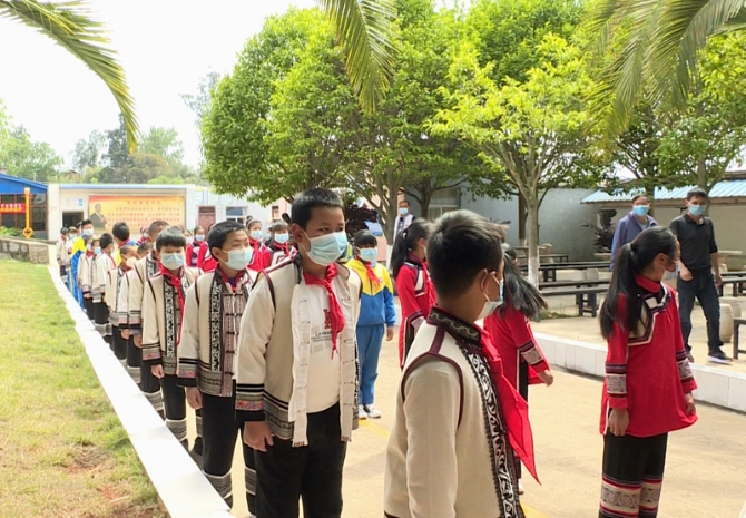 今年县区春季开学根据云南省教育厅的通知文件实行“一校一案”制,达到开学要求的学校,4月26日起小学四、五、六年级可以开学,5月6日起,一、二、三年级可以开学。四、五、六年级开学第一天,石林县各小学都按照要求做好了安全防护工作,在以少数民族为主的乡村小学—长湖中心学校,前来报到的学生排成长队,等待着体温测试和行李、书包消毒,长湖中心学校是一个寄宿制小学,在学生校内生活的每一个细节,学校老师都付出了细微的照顾和监督。