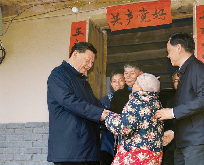 2019年4月15日至17日,中共中央总书记、国家主席、中央军委主席习近平在重庆考察,并主持召开解决“两不愁三保障”突出问题座谈会。这是4月15日下午,习近平在石柱土家族自治县中益乡华溪村看望贫困户谭登周一家。 新华社记者 刘彬/摄