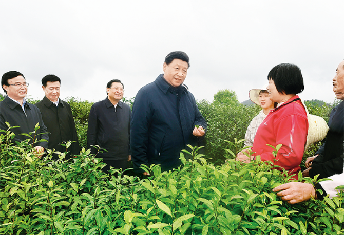 2020年4月20日至23日,中共中央总书记、国家主席、中央军委主席习近平在陕西考察。这是4月21日,习近平在安康市平利县老县镇蒋家坪村女娲凤凰茶业现代示范园区,同茶农们亲切交谈。 新华社记者 谢环驰/摄