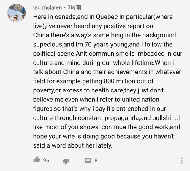 这里是加拿大魁北克。我从来没见过任何关于中国的正面报道,媒体总是感觉在遮遮掩掩些什么。我70岁了,一直都关心政治话题。反共产主义根植在我们的文化里,伴随我们整个人生。当我谈论起中国和其成就时,不论是哪方面的内容,比如8亿人口脱贫,或医疗保险方面的话题,从来没人相信我。即使我援引联合国的数据,他们也不信。所以我说,政治宣传和“垃圾话”在我们的文化中是根深蒂固的。