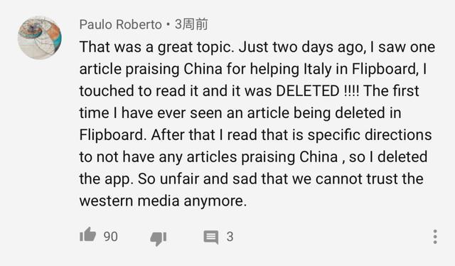 这个主题很棒。就在两天前,我在Flipboard上看到了一篇称赞中国援助的文章,我刚想要读,就被删掉了!这是我第一次看到Flipboard上的文章被删掉。在那以后我知道了他们就是不允许夸中国的文章存在,我就把这个应用卸载了。这也太不公平了,太可悲了。我们再也不能相信任何西方媒体了。