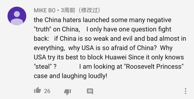 仇华的人编造了很多负面新闻给中国。我只有一个问题:如果中国真的所有地方都这么不堪一击又邪恶,美国为什么要这么怕中国?为什么美国想尽一切办法不让华为进美国?