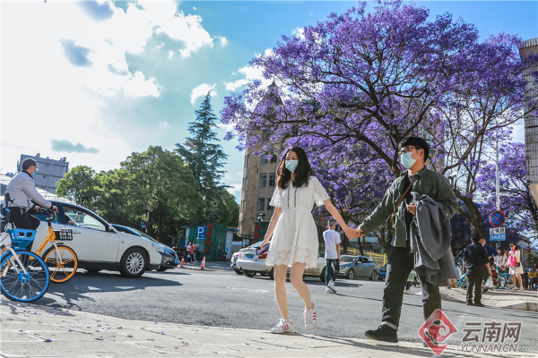“五一小长假”如期来到,昆明市区被蓝花楹装点成曼妙蓝紫色。五一小长假的第一天,昆明“网红街”教场中路、盘龙江、春城路等地不少游客前往这些蓝花楹盛开的地方“打卡”,记录下这美好的瞬间。