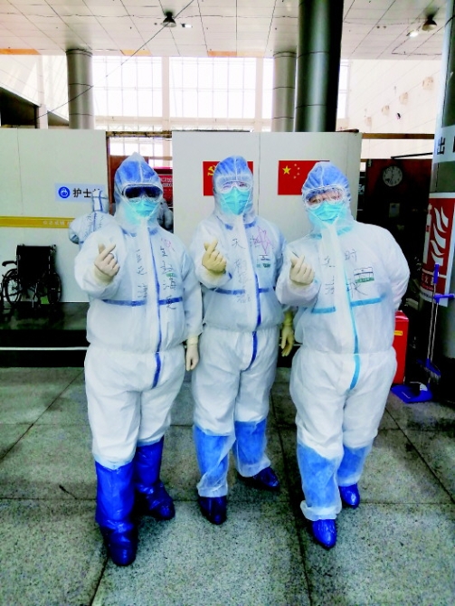 时秋(右一)与医疗队队员们穿戴好防护用品,成为了坚守在武汉江岸方舱医院“红区”的白衣战士。(2月18日摄,受访者供图)