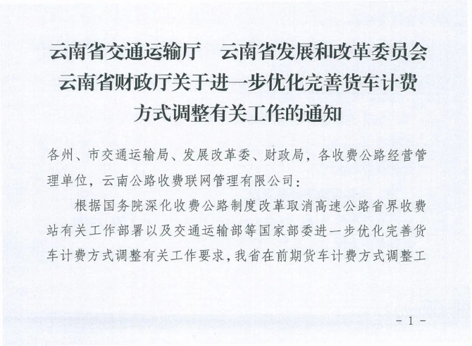 3、云南省交通运输厅 云南省发展和改革委员会 云南省财政厅关于进一步优化完善货车计费方式调整有关工作的通知