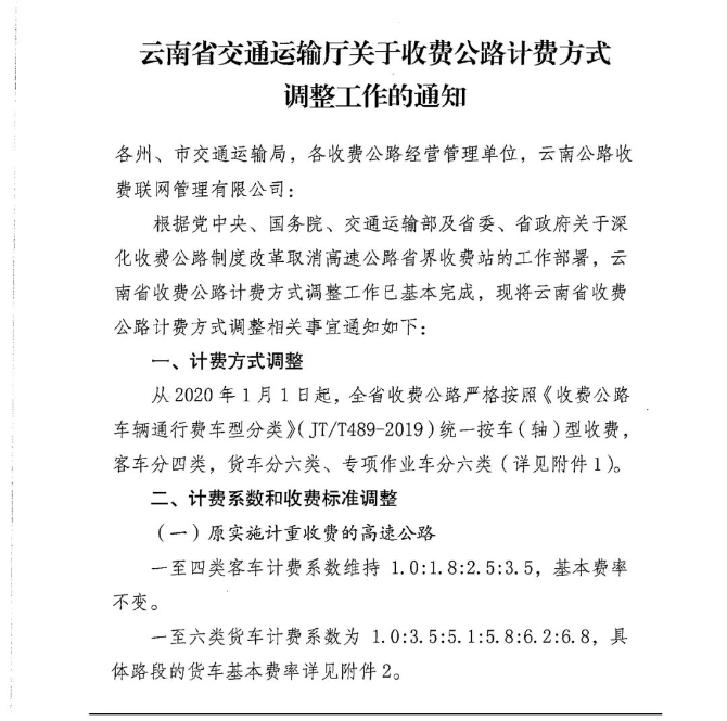 4、云南省交通运输厅关于收费公路计费方式调整工作的通知