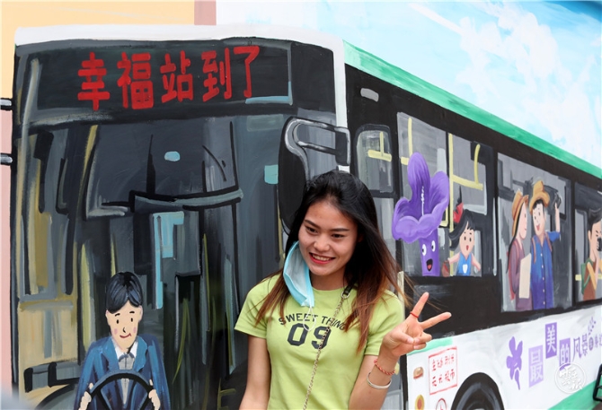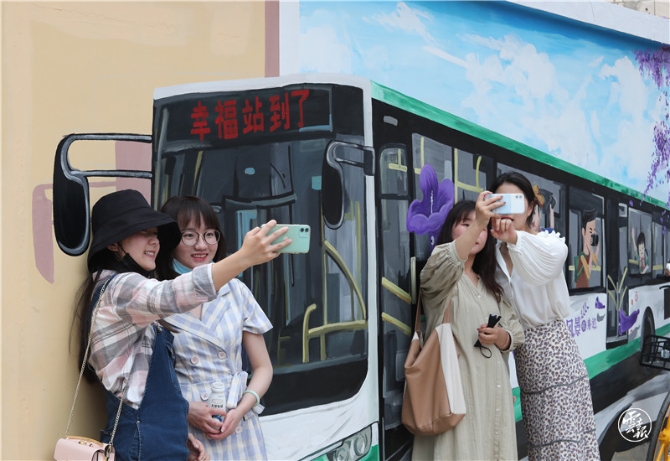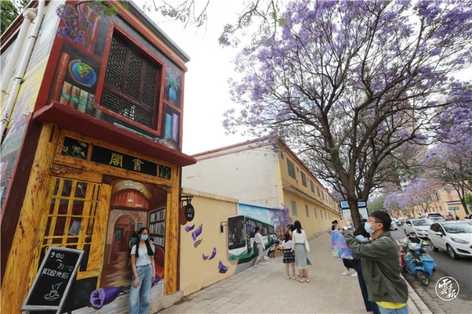 “五一”假日,在昆明教场中路蓝花楹大道,不仅有美丽的蓝花楹景观,以蓝花楹、幸福号公交车以及书阁等文化元素为主题的彩绘墙也为前来赏花观景的市民游人带来一份惊喜,色彩艳丽、特色浓郁的彩绘墙,让昆明网红蓝花楹大道又增添了一道靓丽的文化景观。