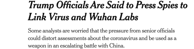 △《纽约时报》4月30日刊文,报道美国政府高层向情报部门施压,要求他们寻找病毒与武汉实验室的关联