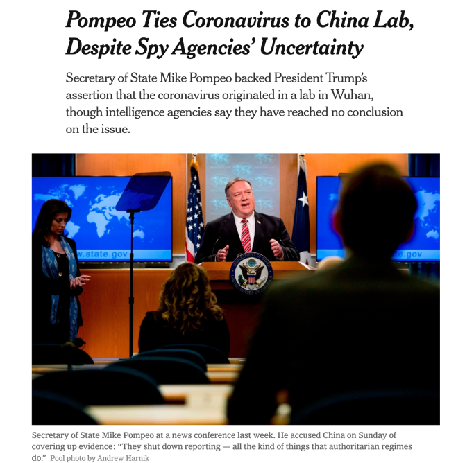 没隔两天,《纽约时报》5月3日继续刊文,指国务卿蓬佩奥不顾情报机构的结论,还在继续强行将新冠病毒与武汉实验室关联。