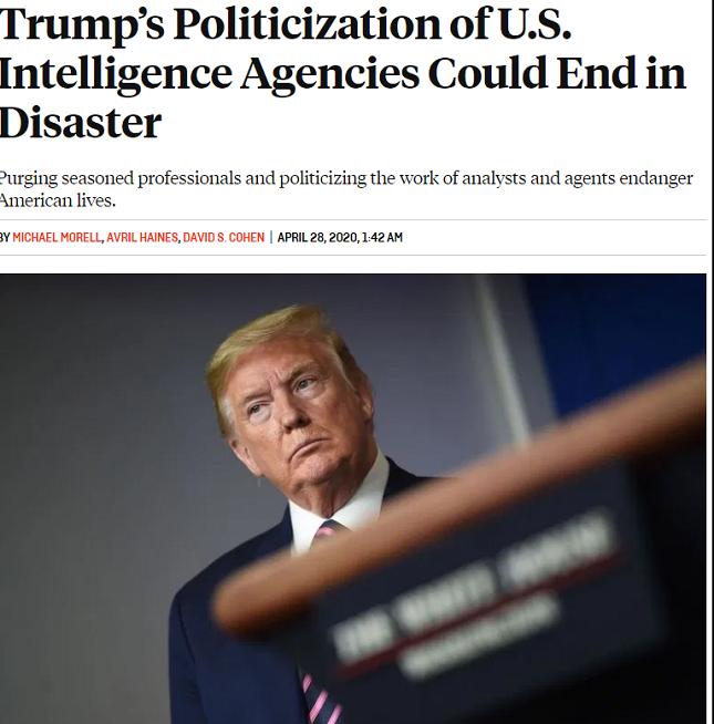 △《外交政策》4月28日发表美国前情报高官联合署名文章,担心情报机构政治化为美国带来灾难