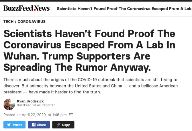 BuzzFeed报道最后认为,不论科学如何解释,对特朗普及其狂热支持者来说,提出“病毒源于中国实验室”都是出于政治利益的考量。报道指出,尽管科学家尚不能确定病毒来源,但可以确定的是,谣言之所以能够如此大范围且快速传播,唯一原因就是,特朗普。