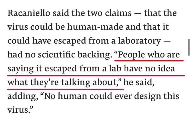 哥伦比亚大学微生物和免疫学教授文森特·雷卡纳罗(Vincent Racaniello)也称,他甚至不愿意把“病毒系实验室制造”的观点称为阴谋论,因为“‘论’都是基于实际结果的,而有关病毒来自实验室的观点,老实说,我觉得是基于政治”。