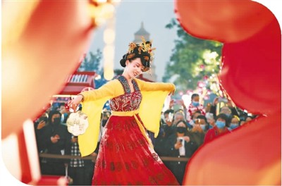4月20日晚,陕西省西安市大唐不夜城的“不倒翁小姐姐”在表演,往来游客驻足拍照。 本报记者 张丹华摄 |