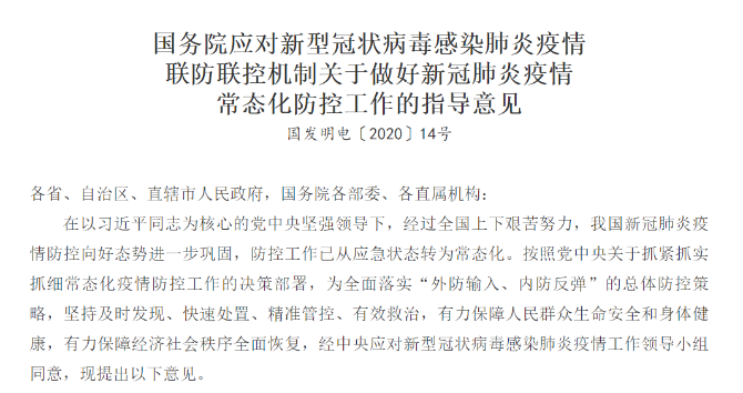 国务院印发应对新型冠状病毒感染肺炎疫情联防联控机制关于做好新冠肺炎疫情常态化防控工作的指导意见。指导意见提出,按照相关技术指南,在落实防控措施前提下,全面开放商场、超市、宾馆、餐馆等生活场所;采取预约、限流等方式,开放公园、旅游景点、运动场所,图书馆、博物馆、美术馆等室内场馆,以及影剧院、游艺厅等密闭式娱乐休闲场所,可举办各类必要的会议、会展活动等。