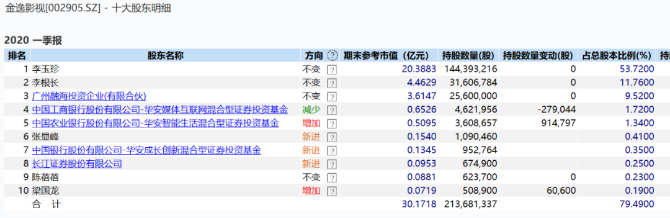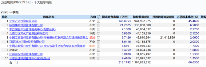 一季度,万达电影前十大股东中,华安传媒互联网混合型证券投资基金、华安智能生活混合型证券投资基金跻身前十,合计持股约7874.1万股,占比3.79%,较去年底的2139.8万股大幅增持。