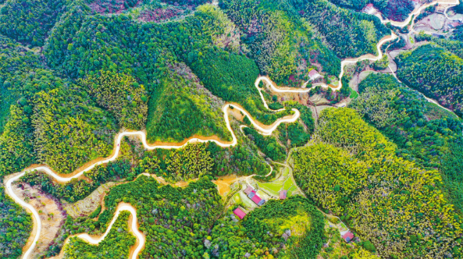 图为2020年1月22日航拍的江西省吉安市泰和县老营盘镇富足村“四好农村路”——竹富公路。它蜿蜒盘旋在延绵的大山间,成为该村的主要进出道路。人民图片 邓和平/摄