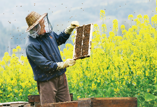 图为2020年3月8日,在重庆市梁平区石安镇联丰村七组,蜂农正在油菜田边放养蜜蜂。目前,该镇养蜂村民达600多户,蜜蜂数量达8000多群,其中有60多户贫困户通过养蜂走上了脱贫致富的道路。中新社记者 刘辉/摄