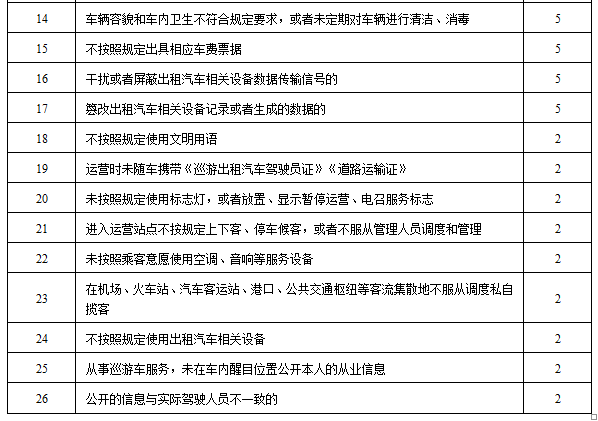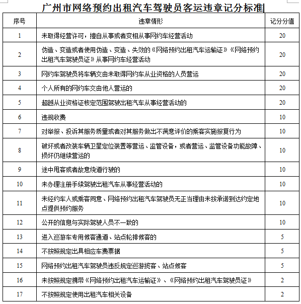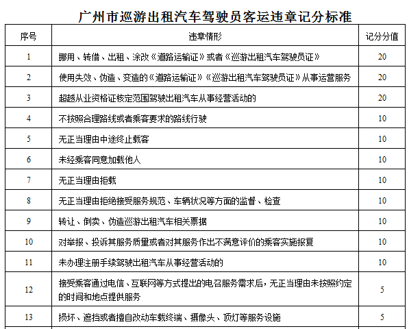 征求意见稿中提到,交通行政主管部门对出租汽车驾驶员违反相关行业管理法律、法规的行为实行记分管理,记分周期为每年8月1日至次年7月31日,每个记分周期内记分累积计算。对出租汽车驾驶员单次违章行为有两种以上违章情形的,分别记分。对出租汽车驾驶员在一个记分周期内,从事巡游出租汽车和网络预约出租汽车营运服务都有违章行为的,记分累积计算。单次记分的分值分为20分、10分、5分、2分四种。具体违章记分分值按照《广州市巡游出租汽车驾驶员客运违章记分标准》和《广州市网络预约出租汽车驾驶员客运违章记分标准》执行。