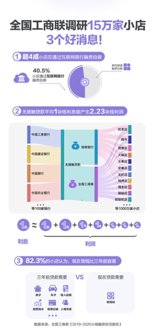 《报告》显示,疫后,小微企业及个体户的资金需求突出,但绝大部分扶一把就能活;40.5%有资金需求的长尾小微经营者在通过互联网银行融资自救;70%获得贷款的小微经营者认为精准“滴灌”的无接触贷款有实效,平均1块钱的利息能产生约2块钱利润。