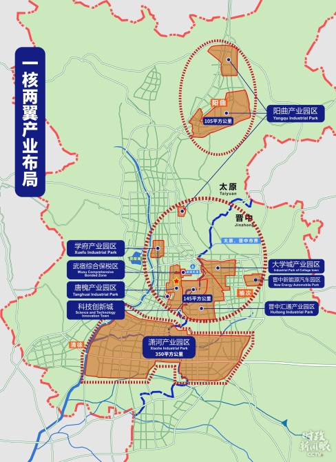 △示范区分为北部阳曲产业园区、中部产业整合区、南部潇河产业园区3大片区,总规划面积约600平方公里。(总台央视记者康晓宇拍摄)