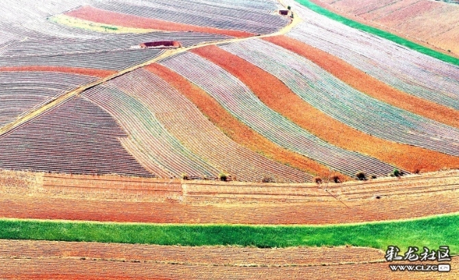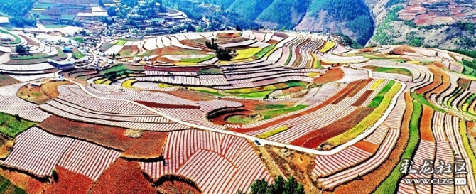 除了东川外,寻甸的金源、金所、甸沙、联合、倘甸和北大营等近百平方公里区域成为云南高原最集中、最典型、最具特色的红土地。一年四季的翻地耕种,青稞和小麦、苕子、土豆、玉米、烤烟套种,绿色、黄色、白色、深色的块状、条状覆盖着大地,远远看去,就像上天涂抹的调色板和用笔画上的多彩线谱,在早霞和晚霞中色彩绚丽斑斓,衬以蓝天、白云和那变幻莫测的光束,构成了红土地美丽壮观的景色。