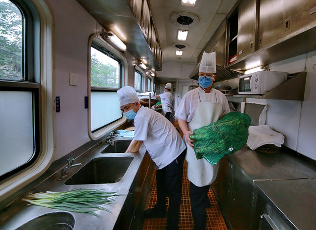 5月8日,成都开往北京方向的T8次列车餐车内,张森(右一)等工作人员在餐车搬运蔬菜。2008年,11岁的张森在都江堰读小学5年级,父母在地震中不幸罹难。此后,张森与700余名震区孩子一起先后在山东日照和成都双流学习生活6年。2014年,张森从职高毕业后,成为铁路成都客运段的一名餐车炊事员。今年,新冠肺炎疫情暴发,他们在自己的岗位上,保障旅客的饮食需求,参与疫情防控阻击战。苏志刚/摄
