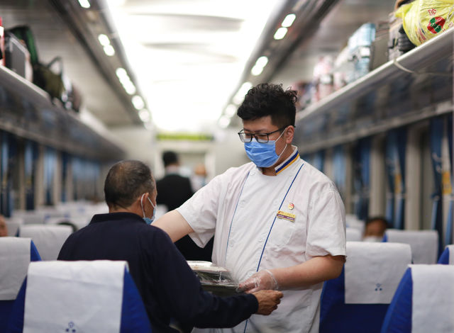 5月8日,成都开往北京西的T8次列车餐车内,张森为旅客送餐到座。疫情防控期间,列车餐车取消了桌餐。为方便旅客用餐,在饭点前,工作人员会来到车厢询问旅客的订餐需求。苏志刚/摄