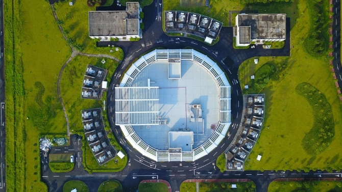 这是2019年7月24日无人机拍摄的位于广东省东莞市大朗镇的中国散裂中子源。(新华社记者刘大伟摄)