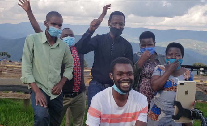 5月14日,卢旺达咖啡农观看直播录像,看到3000斤咖啡瞬间卖光后欢呼。新华社发。