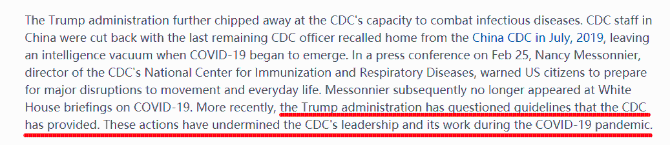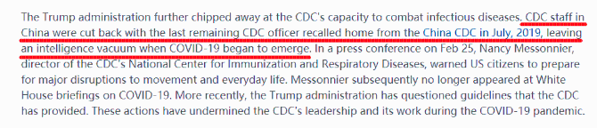 文章说,特朗普政府对CDC工作能力的削弱在新冠肺炎疫情开始前就已存在。早在2019年7月,派驻中国疾控中心的最后一名CDC成员也被召回,这在很大程度上阻碍了两国疾控中心间的沟通。