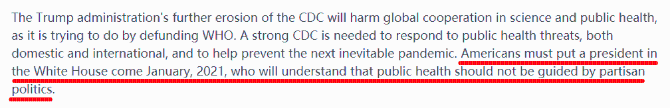 “美国人必须在2021年1月选择一位明白公共卫生事业不应受到党派政治引导的总统。” 《柳叶刀》写道。