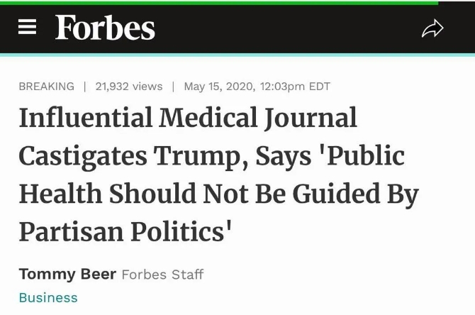 福布斯网站(Forbes)则以“颇具影响力的医学杂志谴责特朗普,称公共卫生不应受到党派政治的指导”刊发了相关文章