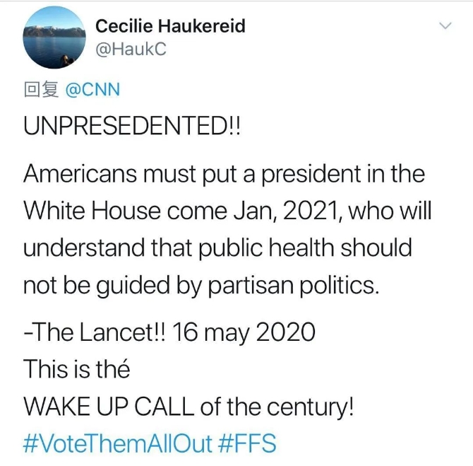 网友评论:无与伦比!美国人必须在2021年1月到白宫选出一位明白公共卫生不应以党派政治为指导的总统。——《柳叶刀》。这是对本世纪的唤醒!