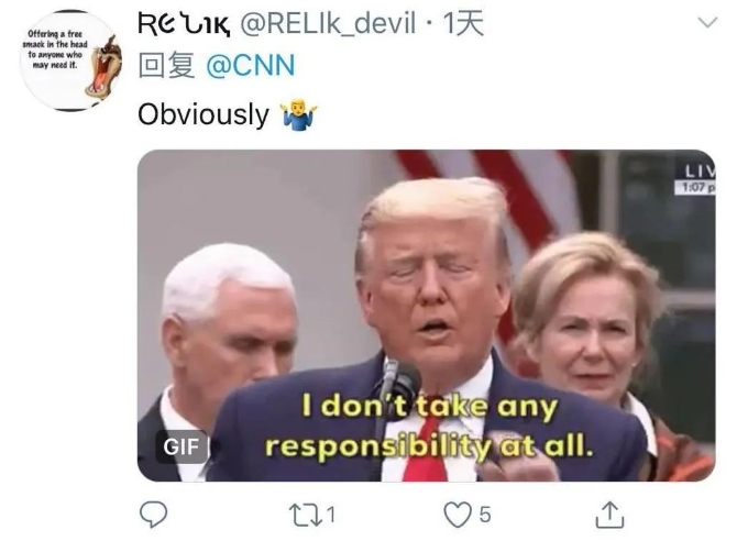 字幕:(特朗普)我不承担任何责任。网友评论:显而易见!