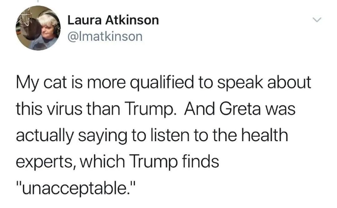 网友评论:我的猫都比特朗普有资格谈论这种病毒。它会听从医学专家的,但对特朗普来说却是“不可接受的”。