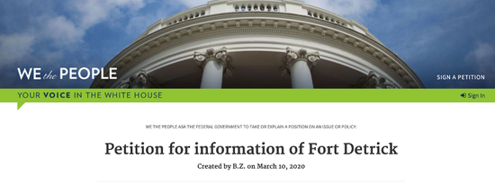 3月10日,名为B.Z。的网民在白宫请愿网站“我们人民(WE the PEOPLE)”发起一条请愿贴,要求美国政府公布去年7月关闭德特里克堡生物实验室的真正原因,以澄清该实验室是否是新冠病毒的研究单位,以及是否存在病毒泄漏问题。